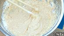 2.卵1個、水200cc、小麦粉200ccを混ぜ合わせ、衣を作る。 |