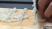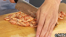 2.川エビを塩で約4分、赤くなるまで塩で茹でる。 茹で上がった川エビを包丁で刻み、細かくする。 |