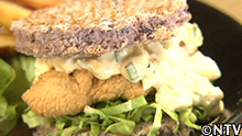 8.キャベツ、フィッシュフライ、タルタルソースとバンズ(上)にはさみ、完成! |