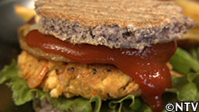 5.レタス、エビと豆腐のハンバーグ、カブをバンズで挟み、エビと豆腐のハンバーガーの完成! |