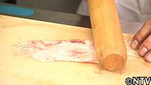 2.豚肉をラップで挟み、めん棒で叩いて平たくする。 |