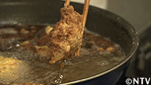 4.薄くなった豚肉に、小麦粉、溶き卵、刻んだそばを付けて揚げる。 |