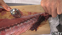 1.キメジの骨の間に残った身をスプーンで削ぐ。 |