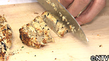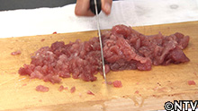 2.キメジの身を包丁でたたく。 |
