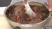 3.そこに細かく刻んだネギ、塩コショウ・小麦粉・酒を加え、よく混ぜ合わせる。 |