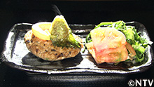7.焼いたハンバーグの上に、ビワ・大葉・青いトマトおろしを乗せ、完成。 |