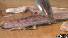 1.アジの骨の間に残った身をスプーンで削ぐ。 |