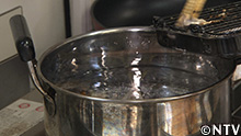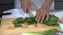 5.小松菜を刻み、お湯の中へ。 |