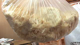 分けて頂いたのは、収穫時期を過ぎてヌルヌルがなくなってしまったなめこ。商品にならない小さなエリンギ、おがくずのついたハナビラタケの根の部分。