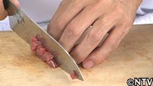 1.牛ロースを角切りにし、水で煮て出汁をとる。 |