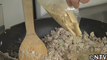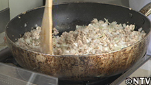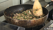 2.サラダ油を入れ、ひき肉を炒める。 火が通ったら挽き肉を加えてさらに炒める。 |