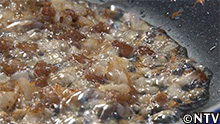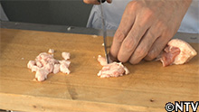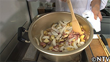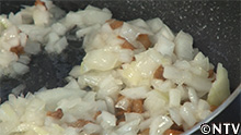3.細かく切った脂身を炒め、そこにみじん切りにしたタマネギを加え、塩胡椒で味付けする。 |