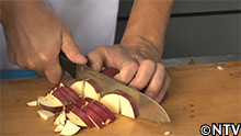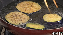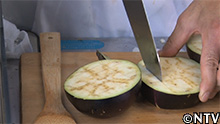 4.賀茂なすを輪切りにし、内側に切れ目を入れる。 |