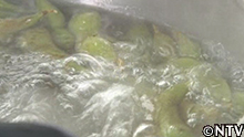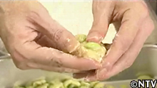 5.(4)に小麦粉をまぶし、溶き卵をつけ、皮を剥いた黒枝豆を衣のようにつける。 |