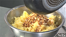 4.つぶしたジャガイモに(3)加えて混ぜ、団子状にまとめる。 |