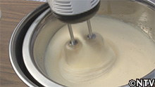 4.卵をハンドミキサーで混ぜ泡立て、砂糖、小麦粉を加えて生地を作る。 |