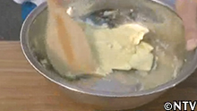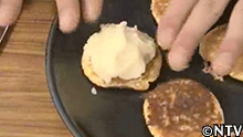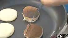 5.(4)を少量ずつフライパンに垂らし、ひっくり返して両面を焼く。 |