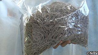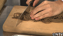 そば生地を麺状に切断した後、乾麺にするため、上の階にある乾燥室へと機械が運ぶが、その際、下に落ちてしまったそばは捨ててしまうとのことで頂いた。