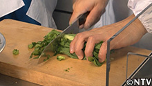 1.野沢菜を1cmほどに、玉ねぎをくし切りに、ムカゴを半分に切る。 |