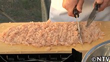 2. マグロを湯に通し、茹で上がったら取り出し、身をほぐす。 |