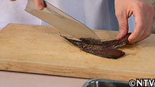 1.キンメの骨と皮を外し、身を細かく切り、包丁で叩く。 |