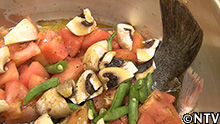 1.トマトを角切り、インゲンを斜めにぶつ切り、 マッシュルームを細かく切る。 |
