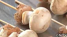 1.一口大に切ったマッシュルーム、 豚ロース肉を串に刺す。 |