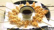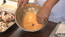 3.小麦粉、卵、水を混ぜた物を(1)につけ、さらに(2)の餅粉をまぶす。 |