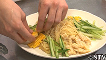 4.細切りしたキュウリ、茹でたトウモロコシをトッピング。 |