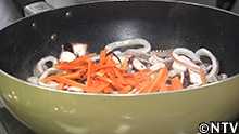 3.タコとイカ、細切りにしたニンジンと長ネギを炒める。 |