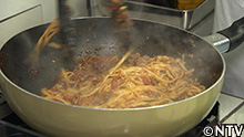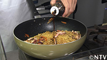 4.(3)に麺(細)を入れ、ウスターソースで味付けをする。 |