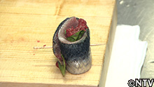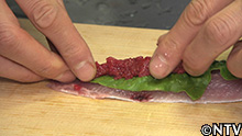 2.おろした魚にほうれん草を乗せ、梅肉をたたいた梅肉ペーストを塗る。 |