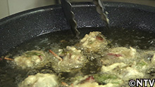 4.(3)に衣をつけて、油でキツネ色になるまで揚げる。 |