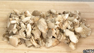 (5)ヒラタケをみじん切りにし、オリーブオイルを引いたフライパンで炒める。 |