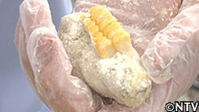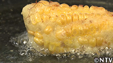 (5)全体にトウモロコシの実を貼り付けたら軽く焦げ目がつくくらいに油で揚げる。 |