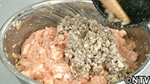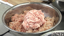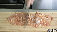 (3)豚肉の脂身もフードプロセッサーにかけてひき肉にし、鶏のひき肉と混ぜて、塩・コショウで味を調えて合いびき肉にする。 |