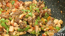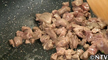 (1)ハツ(鶏の心臓)を細かく切り、オリーブオイルで炒める。 |