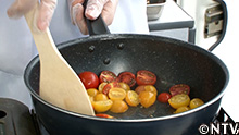 (2)トマトを潰しながら、オリーブオイルで炒めてトマトソースに。 |
