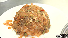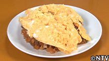 (7)卵を溶いてフライパンで焼き、(6)の上に乗せて完成。 |