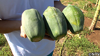 残念ながらフルーツトマトは収穫時期ではなかったが、青パパイヤはいくつかの実が台風で落下し、落ちて傷付いたものは売り物にならないとのことで頂いた。