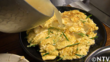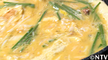 エガニの甲羅でとった出汁に塩・コショウで味を整え、片栗粉でとろみをつけると餡になる。 炒めたカニ玉に餡をかける。 |