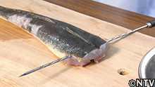 コチの頭を落とし、内臓を取り除き身を串で刺す。 |
