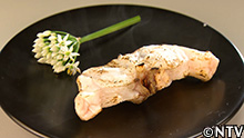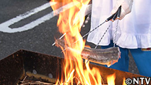 バーベキュー用のコンロに藁を乗せて、さっと炙る。 高温で一気に炙ることで旨みが閉じ込められる。 |