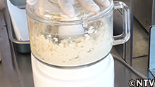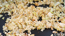 牛脂を敷いたフライパンにみじん切りにした青パパイヤとにんにくを炒め、塩・コショウで味を整える。 火が通ったら、バットに移し熱をとる。 |