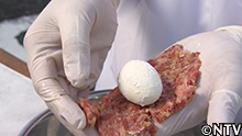 炒めた青パパイヤとにんにくを牛肉のミンチと混ぜる。 野菜と混ぜ合わせたミンチを手のひらサイズで薄く伸ばし、小麦粉をまぶしたゆで卵をミンチで包む。 |