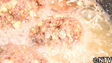 ミンチに小麦粉をまぶし、牛脂を溶かした油で揚げる。 |