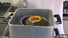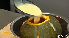ザルでこし、固形物をとりのぞいたら、くり抜いたかぼちゃの器に流し入れる。 |