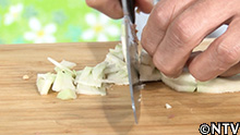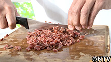 ポークジャーキーを細かく刻んで、熱湯で柔らかくする。 柔らかくなったらみじん切りに。 |