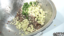刻んだ具材に黒ごま油、白コショウ、片栗粉を入れよく混ぜ合わせると小籠包の具が完成。 |