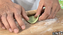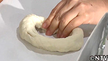 麺から作った白と緑の生地をドーナッツ状にして、5cm程度ずつ切り分ける。 |